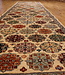 The light, neutral field is beautifully covered with repeating geometric floral medallions, creating a sophisticated all-over pattern that adds movement, balance, and visual interest without overwhelming the space. A palette of all-organic vegetable dyes in soft blues, rust, sage, ivory, and subtle earth tones provides depth and a timeless, versatile look that complements both traditional and modern interiors.